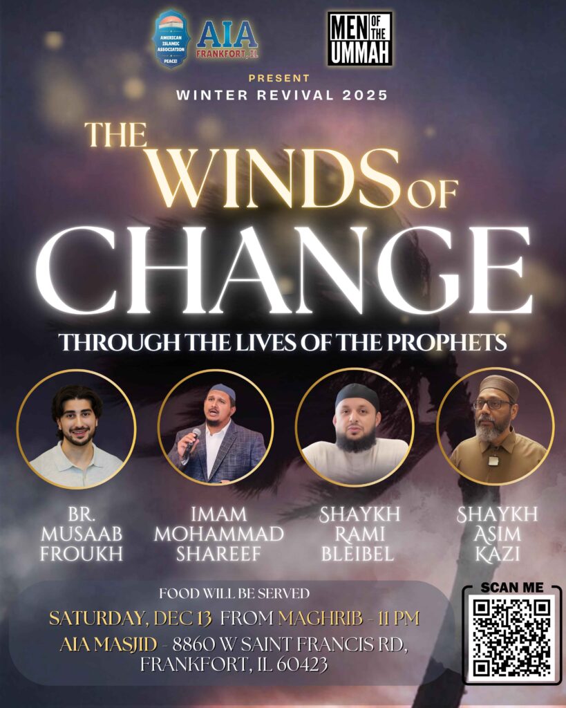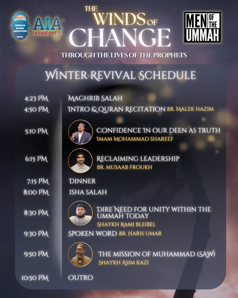 Join us at this year’s conference in collaboration with American Islamic Association in Frankfort, IL to discuss topics such as Confidence in our Deen as the Truth, Reclaiming Leadership, Dire Need for Unity in the Ummah Today, and the Mission of Muhammad (SAW). We will have respected and qualified scholars and speakers including Imam Mohammad Shareef, Brother Musaab Froukh, Shaykh Rami Bleibel, and Shaykh Asim Kazi.